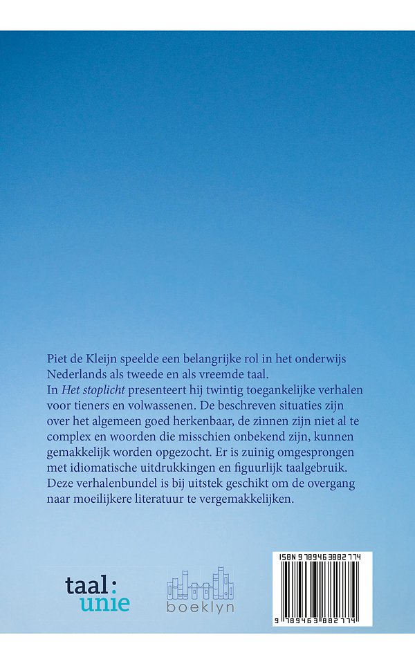 Piet de Kleijn speelde een belangrijke rol in het onderwijs Nederlands als tweede en als vreemde taal. In Het stoplicht presenteert hij twintig toegankelijke verhalen voor tieners en volwassenen. De beschreven situaties zijn over het algemeen goed herkenbaar, de zinnen zijn niet al te complex en woorden die misschien onbekend zijn, kunnen gemakkelijk worden opgezocht. Er is zuinig omgesprongen met idiomatische uitdrukkingen en figuurlijk taalgebruik.