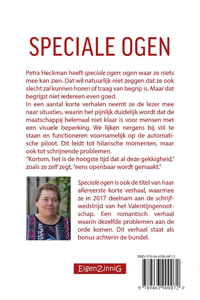 "Speciale ogen" is ook de titel van haar allereerste korte verhaal, waarmee ze in 2017 deelnam aan de schrijfwedstrijd van het Valentijngenootschap. Een romantisch verhaal waarin dezelfde problemen aan de orde komen. Dit verhaal staat als bonus achterin de bundel.