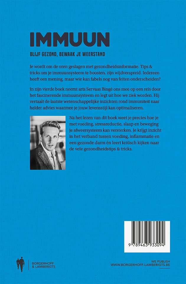 In zijn vierde boek neemt arts Servaas Bingé ons mee op een reis door het fascinerende immuunsysteem en legt uit hoe we ziek worden. Hij vertaalt de laatste wetenschappelijke inzichten rond immuniteit naar helder advies waarmee je jouw levensstijl kan optimaliseren.