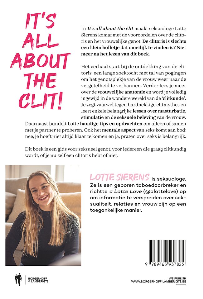 In It’s all about the clit maakt seksuologe Lotte Sierens komaf met de vooroordelen over de clitoris en het vrouwelijke genot. De clitoris is slechts een klein bolletje dat moeilijk te vinden is? Niet meer na het lezen van dit boek.