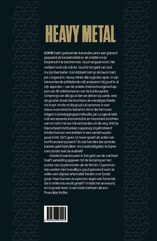 Goud heeft gedurende duizenden jaren een glansrol gespeeld als betaalmiddel en als middel om je koopkracht te beschermen. Goud vergaat nooit. Het verliest nooit zijn luister. Goud is het geld van God. Na zijn Bestseller God dobbelt niet op de beurs trekt Jan Longeval in Heavy Metal alle registers open. In zijn kenmerkende prikkelende stijl analyseert hij goud in al zijn aspecten – van de unieke chemische eigenschappen van dit edelmetaal en van de buitenaardse oorsprong van alle goud dat we delven op aarde, over de gouden draad die doorheen de wereldgeschiedenis loopt, tot de rol die goud zal opnemen in een nieuw economische bestel en de rol die het moet krijgen in je beleggingsportefeuille. Jan Longeval reikt ook verrassende economische en monetaire inzichten aan en ruimt tal van misverstanden uit de weg. Wist je bijvoorbeeld dat banken nagenoeg ongelimiteerd krediet kunnen verstrekken in een wereld waarin goud sinds 1971 geen rol meer speelt als anker van het financieel systeem? En dat het idee dat centrale banken geld bijdrukken om staatsobligaties te kopen niet strookt met de realiteit?