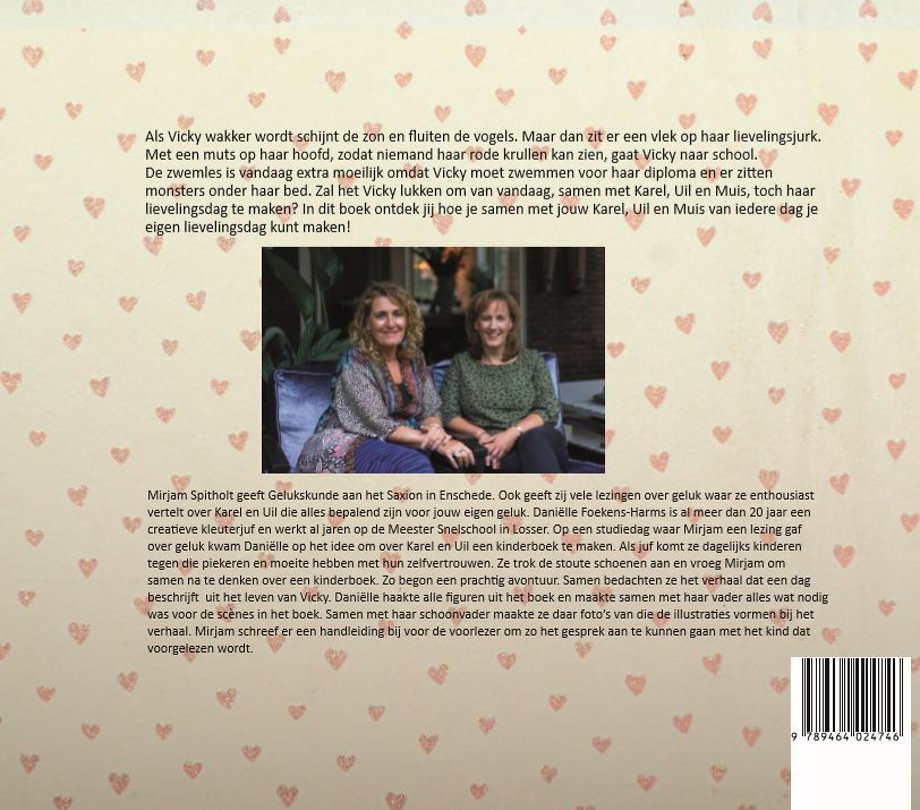 Als Vicky wakker wordt schijnt de zon en fluiten de vogels. Maar dan zit er een vlek op haar lievelingsjurk. Met een muts op haar hoofd, zodat niemand haar rode krullen kan zien, gaat Vicky naar school. De zwemles is vandaag extra moeilijk omdat Vicky moet zwemmen voor haar diploma. Eenmaal thuis zitten er spoken onder haar bed. Zal het Vicky lukken om van vandaag, samen met Karel, Uil en Muis, tóch haar lievelingsdag te maken? In dit boek ontdek jij hoe je, samen met jouw Karel, Uil en Muis, van iedere dag je eigen lievelingsdag kunt maken!