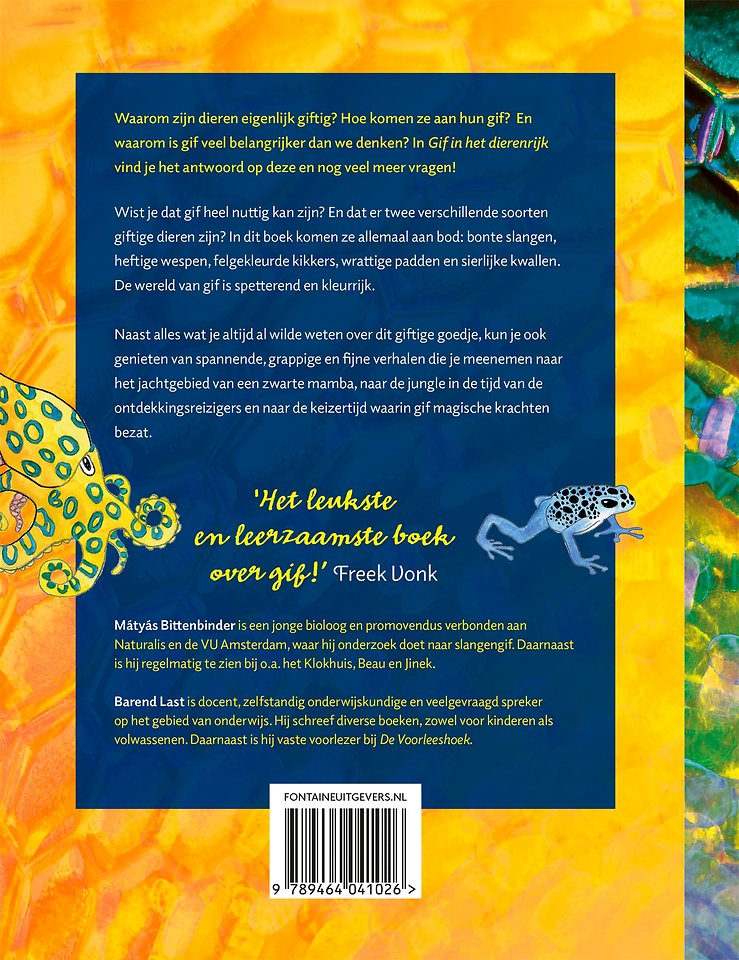 Goeie vraag: waarom zijn dieren eigenlijk giftig? Hoe komen ze aan hun gif? En waarom is gif veel belangrijker dan we denken? Er is nog zoveel te leren over gif: over het gevaar, maar ook over de genezende krachten en het belang voor overleven. Het volledige kleurige register wordt opengetrokken in dit boek: bonte slangen, heftige wespen met hun gifangels, felgekleurde kikkers, padden met hun wrattige huid en sierlijke lichtgevende kwallen. De wereld van gif is namelijk ook een heel spetterende, knetterende en kleurrijke wereld.