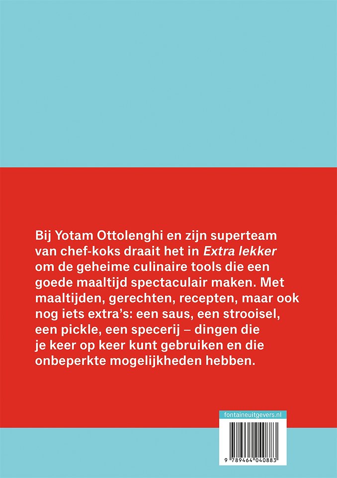 In Extra lekker, het tweede deel in de OTK-serie, laat de Ottolenghi Test Kitchen zien hoe je op eenvoudige maar indrukwekkende wijze smaakvolle, doordeweekse gerechten iets 'extra's' kunt geven. Denk aan een harissaboter die je geroosterde champignons, gestoomde groenten of gepofte aardappels extra verrukkelijk maken. Of een tamarindedressing op gebakken kurkumaeieren die ook heerlijk is over een perfect gebakken biefstuk. Maar ook desserts die je kunt perfectioneren en vervolgens kunt aanpassen aan je favoriete smaakcombinaties, zoals een basismousse omgevormd tot koffiemousse met tahini-fudge.