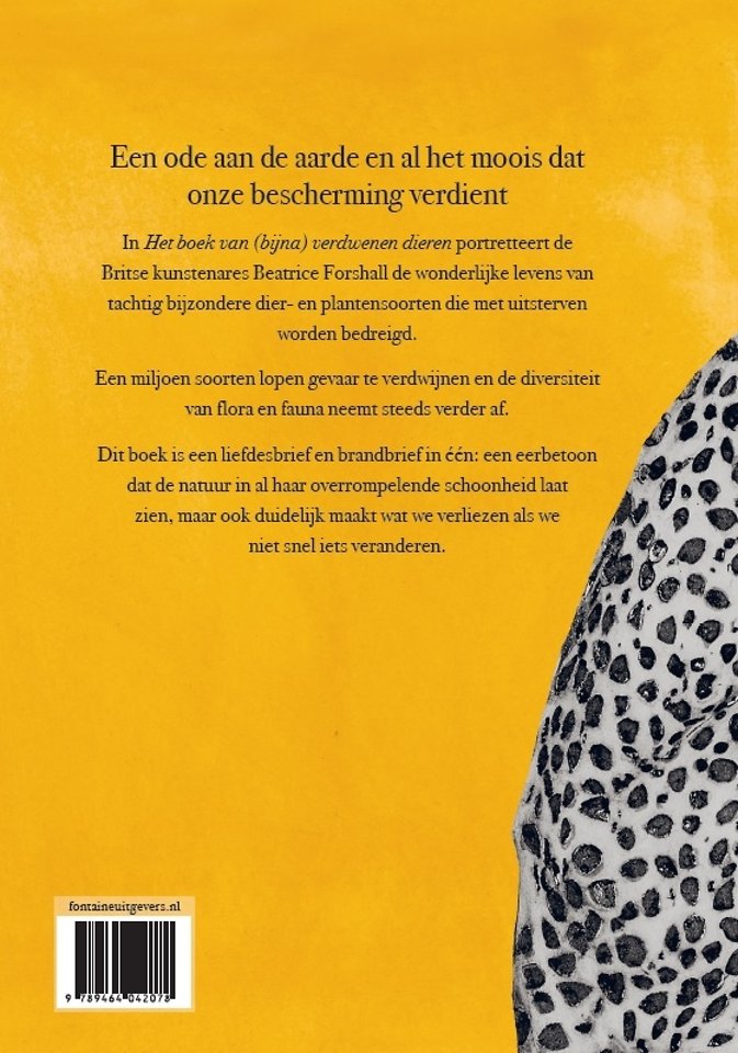 De Britse kunstenares Beatrice Forshall portretteert de wonderlijke levens van tachtig bijzondere dier- en plantensoorten die met uitsterven worden bedreigd. Het boek van (bijna) verdwenen dieren is een ode aan de aarde en een oproep tot het verdedigen van al het moois dat onze bescherming verdient. We zien dansende kraanvogels, lezen over een slimme zeeslak die diep onder water een ijzeren huis bouwt en verwonderen ons over deze wezens die al honderdduizenden jaren weten te overleven, maar nu een onzekere toekomst tegemoet gaan.