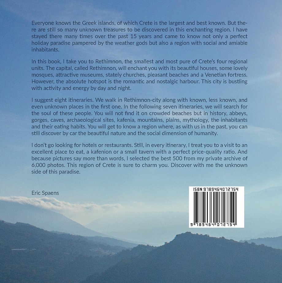 Everyone knows the Greek islands, of which Crete is the largest and best known. But there are still so many unknown treasures to be discovered in this enchanting region. Eric Spaens stayed there many times over the past fifteen years. As a result, he came to know not only an outstanding holiday paradise pampered by the weather gods but also a region with social and amicable inhabitants.
