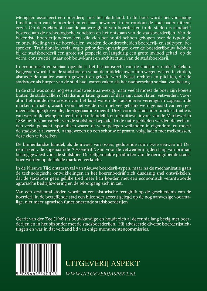 Menigeen associeert een boerderij met het platteland. In dit boek wordt het voormalig functioneren van de boerderijen en haar bewoners in en rondom de stad nader uiteengezet. Op de zoektocht naar de aanwezigheid van boerderijen in de steden is aandacht besteed aan de archeologische vondsten en het ontstaan van de stadsboerderijen. Van de bekendste boerderijonderzoekers, die zich het hoofd hebben gebogen over de typologie en ontwikkeling van de boerderijen, worden de onderscheiden boerderij- en staltypen besproken. Traditionele, veelal regio gebonden opvattingen over de boerderijbouw hebben bij de stadsboerderij een grote rol gespeeld en langdurig een grote invloed gehad op de vorm, constructie, maar ook bouwkunst en architectuur van de stadsboerderij.