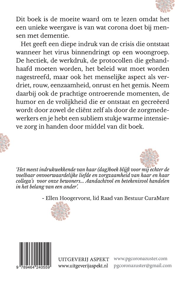 In dit boek wordt de crisis voelbaar die ontstaat wanneer het virus binnendringt op een woongroep. De lezer wordt meegenomen in de hectiek, de werkdruk, de protocollen die gehandhaafd moeten worden en het beleid dat moet worden nagestreefd. Maar ook de menselijke aspecten, zoals verdriet, rouw, eenzaamheid, onrust en het gemis, komen voorbij. En, niet te vergeten, de prachtige, ontroerende momenten, de humor en de vrolijkheid van zowel de cliënten als de zorgmedewerkers.