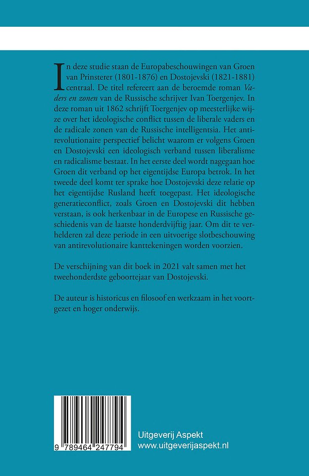 In deze studie staan de Europabeschouwingen van Groen van Prinsterer (1801-1876) en Dostojevski (1821-1881) centraal. De titel refereert aan de beroemde roman Vaders en zonen van de Russische schrijver Ivan Toergenjev. In deze roman uit 1862 schrijft Toergenjev op meesterlijke wijze over het ideologische conflict tussen de liberale vaders en de radicale zonen van de Russische intelligentsia. Het antirevolutionaire perspectief belicht waarom er volgens Groen en Dostojevski een ideologisch verband tussen liberalisme en radicalisme bestaat. In het eerste deel wordt nagegaan hoe Groen dit verband op het eigentijdse Europa betrok. In het tweede deel komt ter sprake hoe Dostojevski deze relatie op het eigentijdse Rusland heeft toegepast. Het ideologische generatieconflict, zoals Groen en Dostojevski dit hebben verstaan, is ook herkenbaar in de Europese en Russische geschiedenis van de laatste honderdvijftig jaar. Om dit te verhelderen zal deze periode in een uitvoerige slotbeschouwing van antirevolutionaire kanttekeningen worden voorzien.