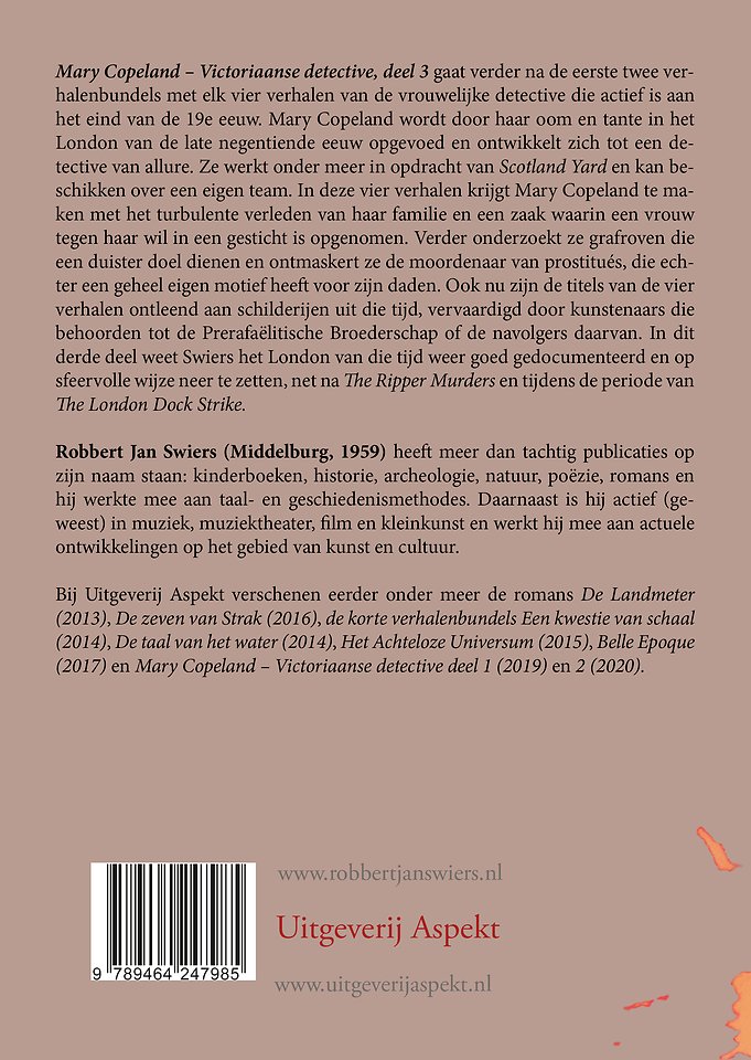 Mary Copeland – Victoriaanse detective, deel 3 gaat verder na de eerste twee verhalenbundels met elk vier verhalen van de vrouwelijke detective die actief is aan het eind van de 19e eeuw. Mary Copeland wordt door haar oom en tante in het London van de late negentiende eeuw opgevoed en ontwikkelt zich tot een detective van allure. Ze werkt onder meer in opdracht van Scotland Yard en kan beschikken over een eigen team. In deze vier verhalen krijgt Mary Copeland te maken met het turbulente verleden van haar familie en een zaak waarin een vrouw tegen haar wil in een gesticht is opgenomen. Verder onderzoekt ze grafroven die een duister doel dienen en ontmaskert ze de moordenaar van prostitués, die echter een geheel eigen motief heeft voor zijn daden. Ook nu zijn de titels van de vier verhalen ontleend aan schilderijen uit die tijd, vervaardigd door kunstenaars die behoorden tot de Prerafaëlitische Broederschap of de navolgers daarvan. In dit derde deel weet Swiers het London van die tijd weer goed gedocumenteerd en op sfeervolle wijze neer te zetten, net na The Ripper Murders en tijdens de periode van The London Dock Strike.