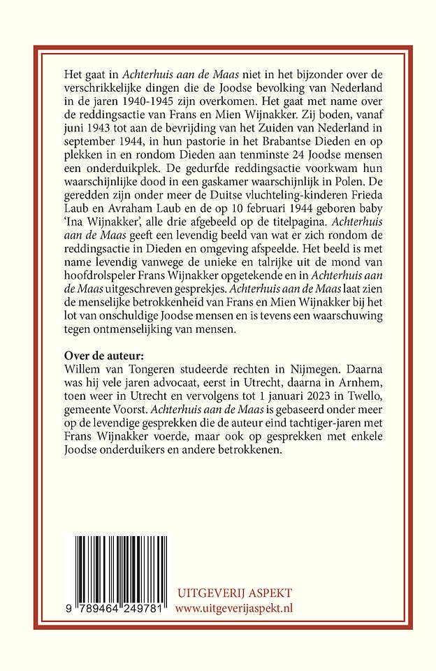 Het gaat in Achterhuis aan de Maas niet in het bijzonder over de verschrikkelijke dingen die de Joodse bevolking van Nederland in de jaren 1940-1945 zijn overkomen. Het gaat met name over de reddingsactie van Frans en Mien Wijnakker. Zij boden, vanaf juni 1943 tot aan de bevrijding van het Zuiden van Nederland in september 1944, in hun pastorie in het Brabantse Dieden en op plekken in en rondom Dieden aan tenminste 24 Joodse mensen een onderduikplek. De gedurfde reddingsactie voorkwam hun waarschijnlijke dood in een gaskamer waarschijnlijk in Polen. De geredden zijn onder meer de Duitse vluchteling-kinderen Frieda Laub en Avraham Laub en de op 10 februari 1944 geboren baby ‘Ina Wijnakker’, alle drie afgebeeld op de titelpagina. Achterhuis aan de Maas geeft een levendig beeld van wat er zich rondom de reddingsactie in Dieden en omgeving afspeelde. Het beeld is met name levendig vanwege de unieke en talrijke uit de mond van hoofdrolspeler Frans Wijnakker opgetekende en in Achterhuis aan de Maas uitgeschreven gesprekjes. Achterhuis aan de Maas laat zien de menselijke betrokkenheid van Frans en Mien Wijnakker bij het lot van onschuldige Joodse mensen en is tevens een waarschuwing tegen ontmenselijking van mensen.