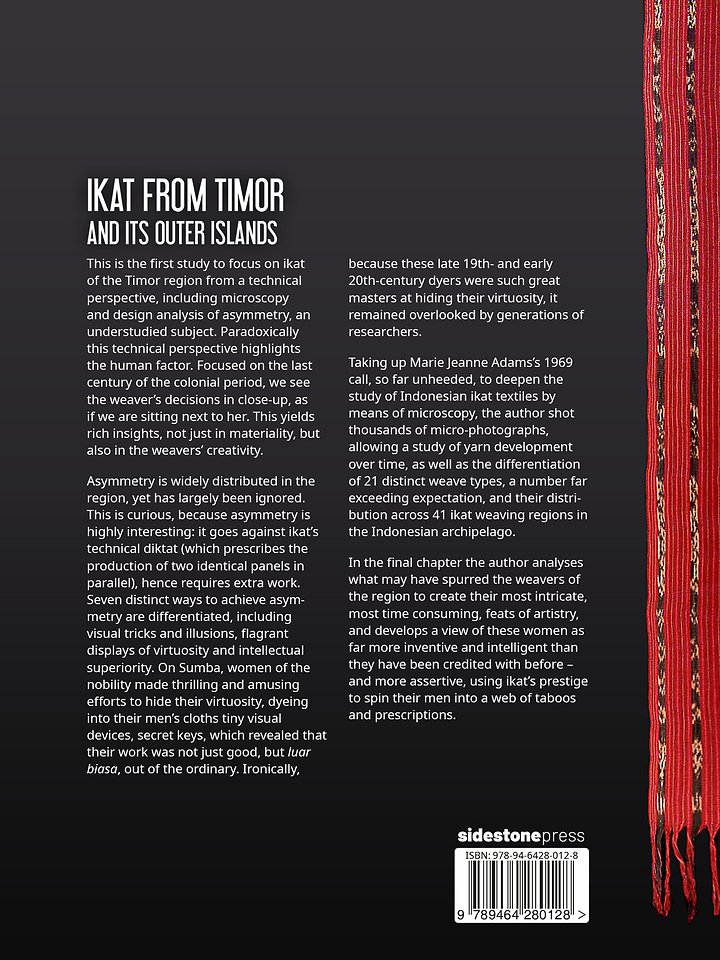 This is the first study to focus on ikat of the Timor region from a technical perspective, including microscopy and design analysis of asymmetry, an understudied subject. Paradoxically this technical perspective highlights the human factor. Focused on the last century of the colonial period, we see the weaver’s decisions in close-up, as if we are sitting next to her. This yields rich insights, not just in materiality, but also in the weavers’ creativity.