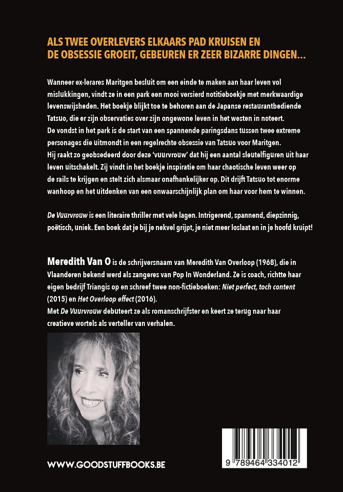 Meredith Van O is de schrijversnaam van Meredith Van Overloop (1968), die in Vlaanderen bekend werd als zangeres van Pop In Wonderland. Ze is coach, richtte haar eigen bedrijf Triangis op en schreef twee non-fictieboeken: ‘Niet perfect, toch content’ (2015) en ‘Het Overloop effect’ (2016). Met ‘De Vuurvrouw’ debuteert ze als romanschrijfster en keert ze terug naar haar creatieve wortels als verteller van verhalen.