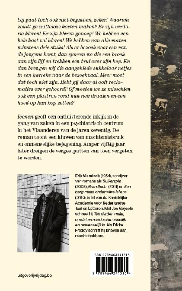 Iconen geeft een ontluisterende inkijk in de gang van zaken in een psychiatrisch centrum in het Vlaanderen van de jaren zeventig. De roman toont een kluwen van machtsmisbruik en onmenselijke bejegening. Amper vijftig jaar later dreigen de vergeetputten van toen vergeten te worden.