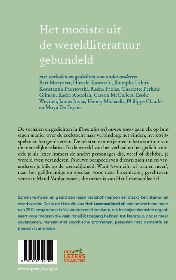wereld even veranderen. Nieuwe perspectieven dienen zich aan en veranderen je blik op de werkelijkheid. Want ‘even zijn wij samen meer’, naar het gelijknamige en speciaal voor deze bloemlezing geschreven vers van Maud Vanhauwaert, die meter is van Het Lezerscollectief.