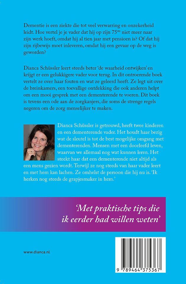 Dianca Schüssler leert steeds beter ‘de waarheid ontwijken’ en krijgt er een gelukkigere vader voor terug. In dit ontroerende boek vertelt ze over haar fouten en wat ze geleerd heeft. Ze schrijft over de breinkamers, een toevallige ontdekking die ook anderen helpt om een mooi gesprek met mensen met dementie te voeren. Dit boek is ook een ode aan de zorgkanjers, die soms de strenge regels negeren om de zorg menselijker te maken.