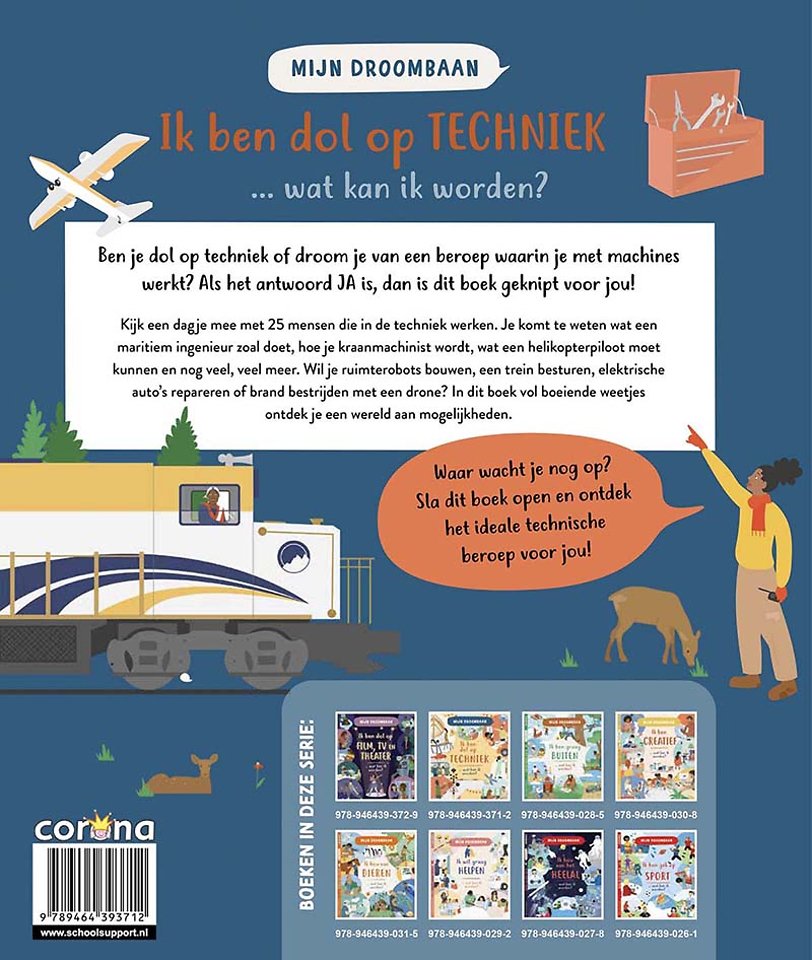 Kijk een dagje mee met 25 mensen die in de techniek werken. Je komt te weten wat een maritiem ingenieur zoal doet, hoe je kraanmachinist wordt, wat een helikopterpiloot moet kunnen en nog veel, veel meer. Wil je ruimterobots bouwen, een trein besturen, elektrische auto’s repareren of brand bestrijden met een drone? In dit boek vol boeiende weetjes ontdek je een wereld aan mogelijkheden.