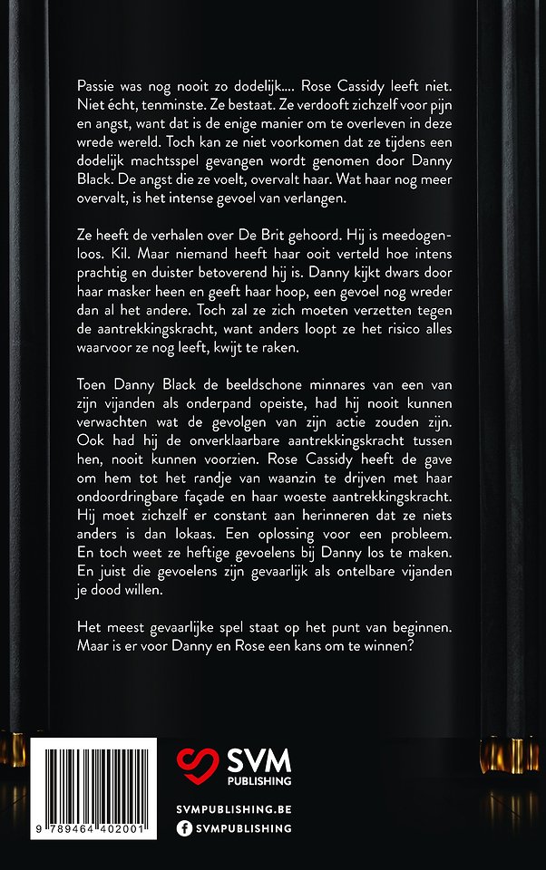 Passie was nog nooit zo dodelijk…. Rose Cassidy leeft niet. Niet écht, tenminste. Ze bestaat. Ze verdooft zichzelf voor pijn en angst, want dat is de enige manier om te overleven in deze wrede wereld. Toch kan ze niet voorkomen dat ze tijdens een dodelijk machtsspel gevangen wordt genomen door Danny Black. De angst die ze voelt, overvalt haar. Wat haar nog meer overvalt, is het intense gevoel van verlangen.
