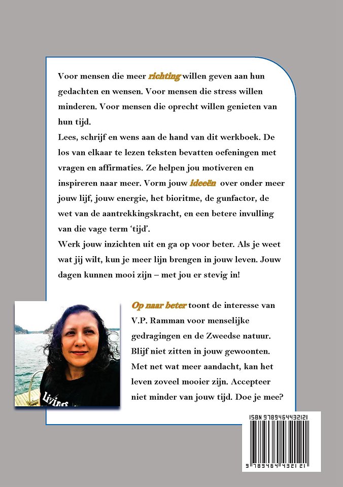‘Op naar beter’ is een inspirerend en motiverend werkboek voor mensen die meer richting willen geven aan hun gedachten. Met tips voor mensen die stress blijvend willen minderen in hun dagelijks bestaan. Herkenbare materie confronteert jou met je eigen doen en laten – en soms die van anderen. Elk onderwerp en elke oefening kun je los oefenen, op naar een beter ‘zijn’.