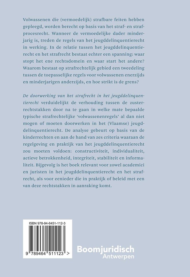 Waarom bestaat op strafrechtelijk gebied een tweedeling tussen de toepasselijke regels voor volwassenen enerzijds en minderjarigen anderzijds, en hoe strikt is de grens? De doorwerking van het strafrecht in het jeugddelinquentierecht beoogt de verhouding tussen de zusterrechtstakken te verduidelijken door na te gaan in welke mate bepaalde typische strafrechtelijke ‘volwassenenregels’ wel of niet mogen of moeten doorwerken in het (Vlaamse) jeugddelinquentierecht.