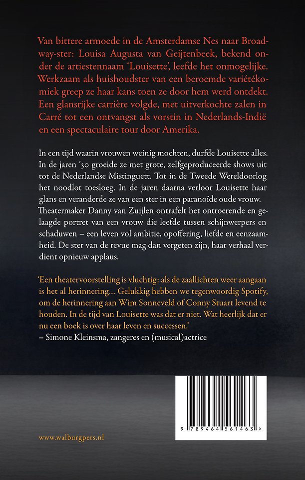 In een tijd waarin vrouwen weinig mochten, durfde Louisette alles. In de jaren '30 groeide ze met grote, zelfgeproduceerde shows uit tot de Nederlandse Mistinguett. Tot in de Tweede Wereldoorlog het noodlot toesloeg. In de jaren daarna verloor Louisette haar glans en veranderde ze van een ster in een paranoïde oude vrouw. Theatermaker Danny van Zuijlen ontrafelt het ontroerende en gelaagde portret van een vrouw die leefde tussen schijnwerpers en schaduwen - een leven vol ambitie, opoffering, liefde en eenzaamheid. De ster van de revue mag dan vergeten zijn, haar verhaal verdient opnieuw applaus.