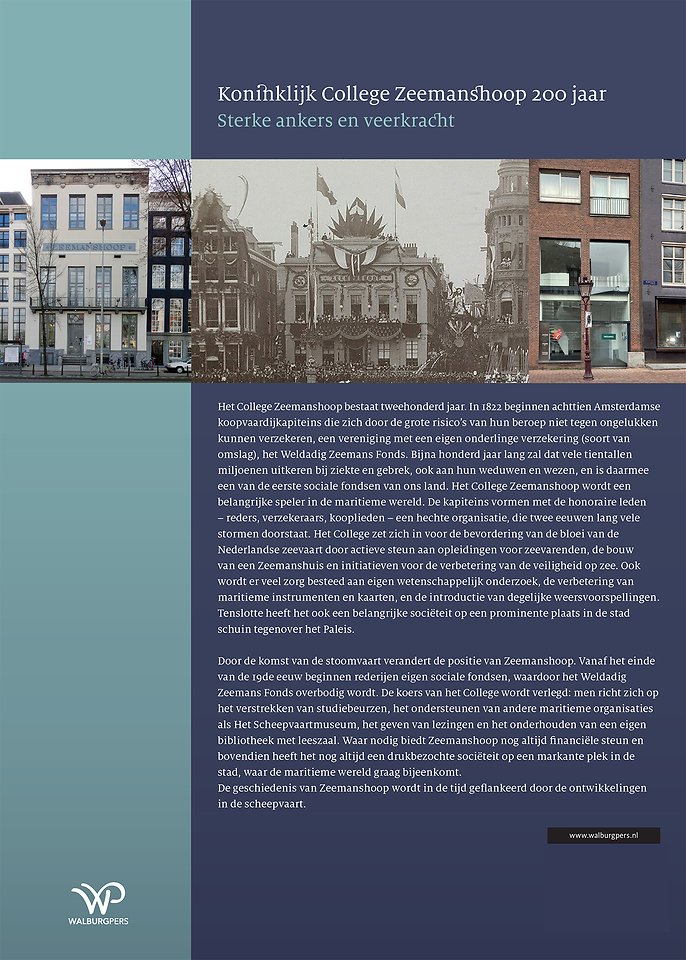 Het College Zeemanshoop bestaat tweehonderd jaar. In 1822 beginnen achttien Amsterdamse koopvaardijkapiteins die zich door de grote risico’s van hun beroep niet tegen ongelukken kunnen verzekeren, een vereniging met een eigen onderlinge verzekering (soort van omslag), het Weldadig Zeemans Fonds. Bijna honderd jaar lang zal dat vele tientallen miljoenen uitkeren bij ziekte en gebrek, ook aan hun weduwen en wezen, en is daarmee een van de eerste sociale fondsen van ons land. Het College Zeemanshoop wordt een belangrijke speler in de maritieme wereld. De kapiteins vormen met de honoraire leden – reders, verzekeraars, kooplieden – een hechte organisatie, die twee eeuwen lang vele stormen doorstaat. Het College zet zich in voor de bevordering van de bloei van de Nederlandse zeevaart door actieve steun aan opleidingen voor zeevarenden, de bouw van een Zeemanshuis en initiatieven voor de verbetering van de veiligheid op zee. Ook wordt er veel zorg besteed aan eigen wetenschappelijk onderzoek, de verbetering van maritieme instrumenten en kaarten, en de introductie van degelijke weersvoorspellingen. Tenslotte heeft het ook een belangrijke sociëteit op een prominente plaats in de stad schuin tegenover het Paleis.