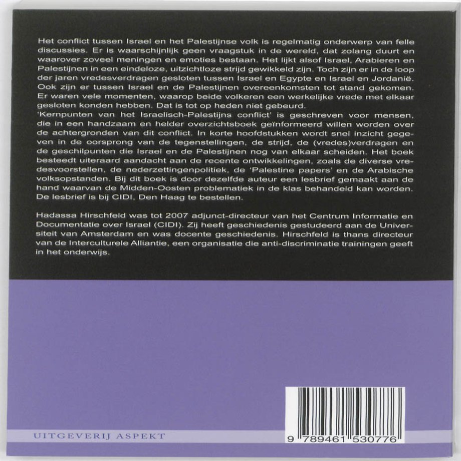 Het conflict tussen Israel en het Palestijnse volk is regelmatig onderwerp van felle discussies. Er is waarschijnlijk geen vraagstuk in de wereld, dat zolang duurt en waarover zoveel meningen en emoties bestaan. Het lijkt alsof Israel, Arabieren en Palestijnen in een eindeloze, uitzichtloze strijd gewikkeld zijn. Toch zijn er in de loop der jaren vredesverdragen gesloten tussen Israel en Egypte en Israel en Jordanië. Ook zijn er tussen Israel en de Palestijnen overeenkomsten tot stand gekomen. Er waren vele momenten, waarop beide volkeren een werkelijke vrede met elkaar gesloten konden hebben. Dat is tot op heden niet gebeurd. 'Kernpunten van het Israelisch-Palestijns conflict' is geschreven voor mensen, die in een handzaam en helder overzichtsboek geïnformeerd willen worden over de achtergronden van dit conflict. In korte hoofdstukken wordt snel inzicht gegeven in de oorsprong van de tegenstellingen, de strijd, de (vredes)verdragen en de geschilpunten die Israel en de Palestijnen nog van elkaar scheiden. Het boek besteedt uiteraard aandacht aan de recente ontwikkelingen, zoals de diverse vredesvoorstellen, de nederzettingenpolitiek, de 'Palestine papers' en de Arabische volksopstanden. Bij dit boek is door dezelfde auteur een lesbrief gemaakt aan de hand waarvan de Midden-Oosten problematiek in de klas behandeld kan worden. De lesbrief is bij CIDI, Den Haag te bestellen. Hadassa Hirschfeld was tot 2007 adjunct-directeur van het Centrum Informatie en Documentatie over Israel (CIDI). Zij heeft geschiedenis gestudeerd aan de Universiteit van Amsterdam en was docente geschiedenis. Hirschfeld is thans directeur van de Interculturele Alliantie, een organisatie die anti-discriminatie trainingen geeft in het onderwijs.