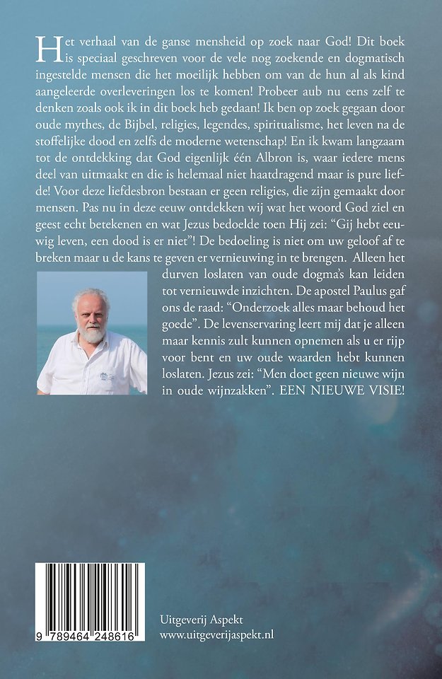 Het verhaal van de ganse mensheid op zoek naar God! Dit boek is speciaal geschreven voor de vele nog zoekende en dogmatisch ingestelde mensen die het moeilijk hebben om van de hun al als kind aangeleerde overleveringen los te komen! Probeer aub nu eens zelf te denken zoals ook ik in dit boek heb gedaan! Ik ben op zoek gegaan door oude mythes, de Bijbel, religies, legendes, spiritualisme, het leven na de stoffelijke dood en zelfs de moderne wetenschap! En ik kwam langzaam tot de ontdekking dat God eigenlijk één Albron is, waar iedere mens deel van uitmaakt en die is helemaal niet haatdragend maar is pure liefde! Voor deze liefdesbron bestaan er geen religies, die zijn gemaakt door mensen. Pas nu in deze eeuw ontdekken wij wat het woord God ziel en geest echt betekenen en wat Jezus bedoelde toen Hij zei: "Gij hebt eeuwig leven, een dood is er niet"! De bedoeling is niet om uw geloof af te breken maar u de kans te geven er vernieuwing in te brengen. Alleen het durven loslaten van oude dogma's kan leiden tot vernieuwde inzichten. De apostel Paulus gaf ons de raad: "Onderzoek alles maar behoud het goede". De levenservaring leert mij dat je alleen maar kennis zult kunnen opnemen als u er rijp voor bent en uw oude waarden hebt kunnen loslaten. Jezus zei: "Men doet geen nieuwe wijn in oude wijnzakken". EEN NIEUWE VISIE!