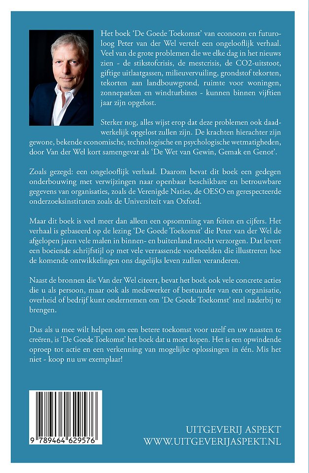 Meer over Peter van der WelHet boek 'De Goede Toekomst' van econoom en futuroloog Peter van der Wel vertelt een ongelooflijk verhaal. Veel van de grote problemen die we elke dag in het nieuws zien - de stikstofcrisis, de mestcrisis, de CO2-uitstoot, giftige uitlaatgassen, milieuvervuiling, grondstof tekorten, tekorten aan landbouwgrond, ruimte voor woningen, zonneparken en windturbines - kunnen binnen vijftien jaar zijn opgelost.