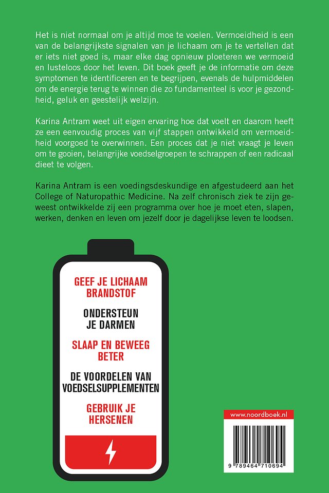 Karina Antram weet uit eigen ervaring hoe dat voelt en daarom heeft ze een eenvoudig proces van vijf stappen ontwikkeld om vermoeidheid voorgoed te overwinnen. Een proces dat je niet vraagt je leven om te gooien, belangrijke voedselgroepen te schrappen of een radicaal dieet te volgen.