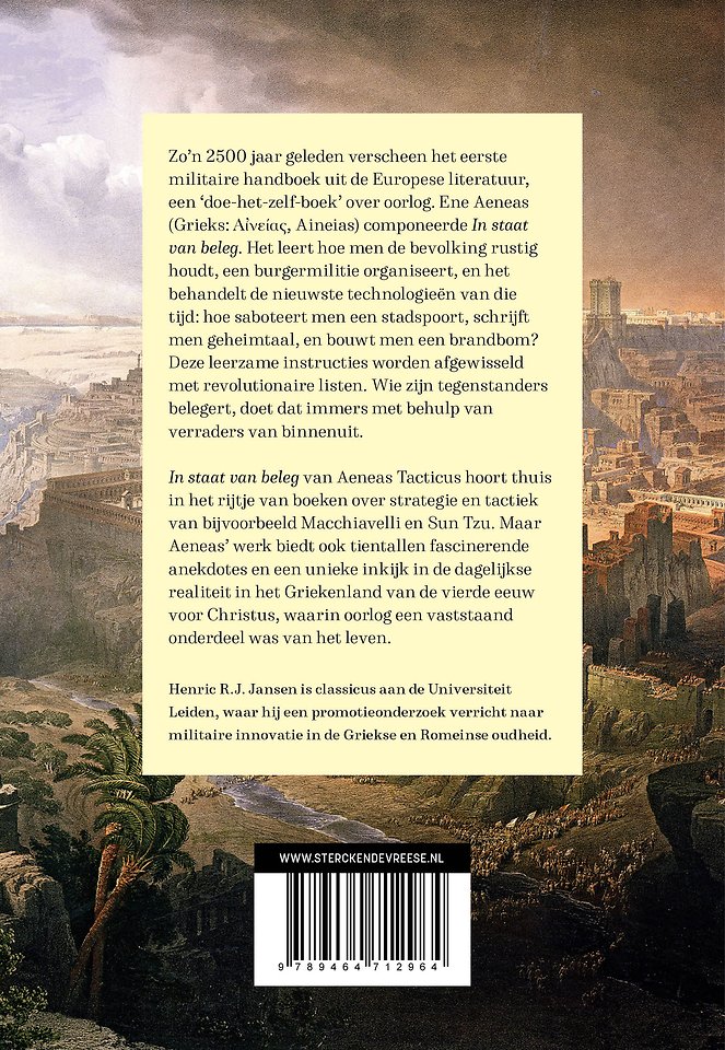 In staat van beleg van Aeneas Tacticus hoort thuis in het rijtje van boeken over strategie en tactiek van bijvoorbeeld Macchiavelli en Sun Tzu. Maar Aeneas’ werk biedt ook tientallen fascinerende anekdotes en een unieke inkijk in de dagelijkse realiteit in het Griekenland van de vierde eeuw voor Christus, waarin oorlog een vaststaand onderdeel was van het leven.