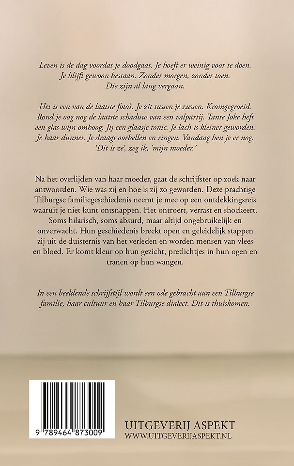 Na het overlijden van haar moeder, gaat de schrijfster op zoek naar antwoorden. Wie was zij en hoe is zij zo geworden. Deze prachtige Tilburgse familiegeschiedenis neemt je mee op een ontdekkingsreis waaruit je niet kunt ontsnappen. Het ontroert, verrast en shockeert. Soms hilarisch, soms absurd, maar altijd ongebruikelijk en onverwacht. Hun geschiedenis breekt open en geleidelijk stappen zij uit de duisternis van het verleden en worden mensen van vlees en bloed. Er komt kleur op hun gezicht, pretlichtjes in hun ogen en tranen op hun wangen.
