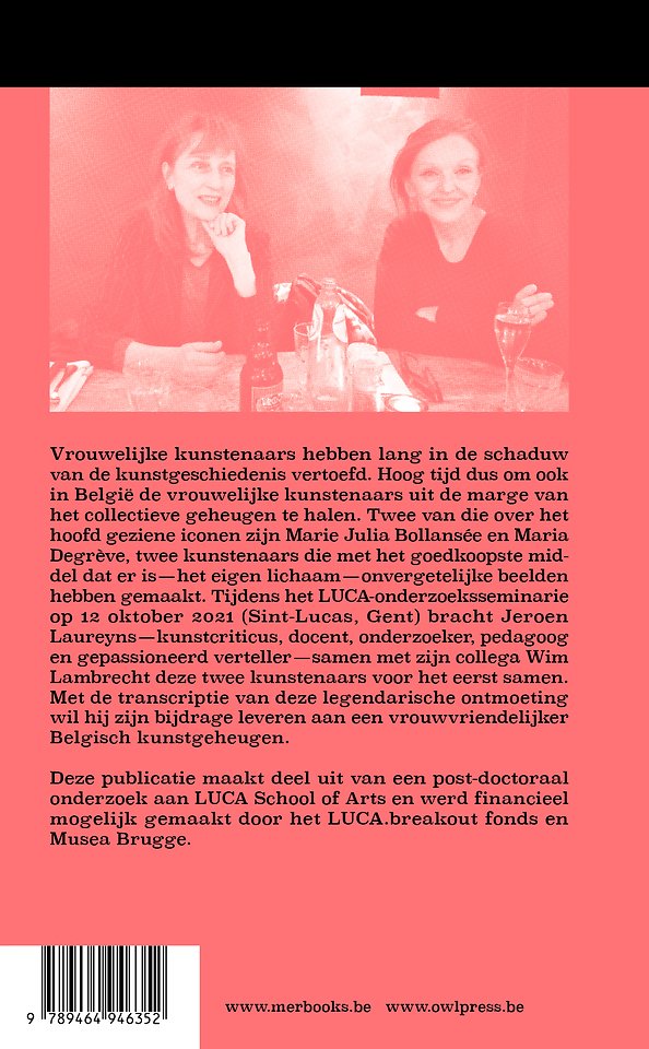 Vrouwelijke kunstenaars hebben lang in de schaduw van de kunstgeschiedenis vertoefd. Hoog tijd dus om ook in België de vrouwelijke kunstenaars uit de marge van het collectieve geheugen te halen. Twee van die over het hoofd geziene iconen zijn Marie Julia Bollansée (°1960) en Maria Degrève, twee kunstenaars die met het goedkoopste middel dat er is – het eigen lichaam – onvergetelijke beelden hebben gemaakt. Tijdens het LUCA-onderzoeksseminarie op 12 oktober 2021 (Sint-Lucas, Gent) bracht Jeroen Laureyns – kunstcriticus, docent, onderzoeker, pedagoog en gepassioneerd verteller – samen met zijn collega Wim Lambrecht deze twee kunstenaars voor het eerst samen. Met de transcriptie van deze legendarische ontmoeting wil hij zijn bijdrage leveren aan een vrouwvriendelijker Belgisch kunstgeheugen.