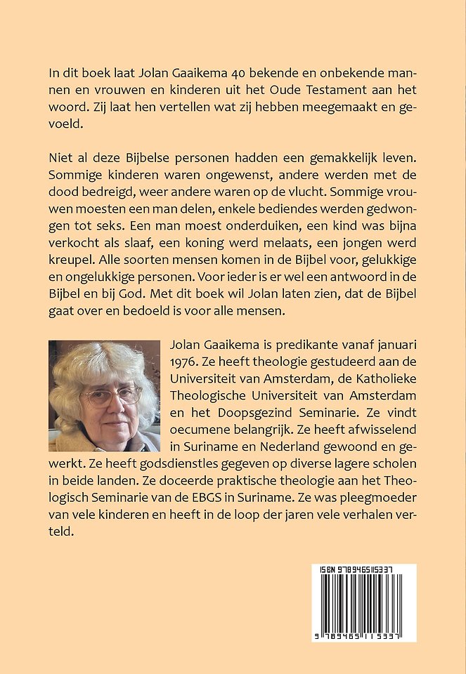 In 'Bijbelse mensen aan het woord' laat Jolan Gaaikema verschillende mannen en vrouwen en kinderen uit het Oude Testament aan het woord. Zij laat hen in de ik-vorm vertellen wat zij gevoeld hebben. Niet al deze Bijbelse personen hebben een gemakkelijk leven gehad. Sommige kinderen zijn met de dood bedreigd, sommige waren op de vlucht. Sommige kinderen waren ongewenst. Sommige vrouwen werden gedwongen tot seks met hun baas. Iemand moest onderduiken, een kind was bijna verkocht als slaaf. De Bijbel is niet een boek waarin alleen maar mooie verhalen staan. Alle soorten mensen komen in de Bijbel voor, gelukkige en juist heel ongelukkige personen. Echter voor ieder mens is er wel een antwoord in de Bijbel en bij God. In dit boek komen 40 personen aan het woord, bekende en minder bekende figuren. Elk vertelt zijn of haar eigen verhaal vanuit het persoonlijke perspectief. Daarmee wil Jolan laten zien, dat de Bijbel een boek is over en voor alle mensen. Enkele personen hebben niet eens een naam, maar ze worden wel genoemd en misschien is dat juist fijn voor mensen, die zich onbelangrijk voelen en die door weinigen worden gekend, want ook deze mensen horen erbij en horen bij God. Dit is geen theologisch boek. De schrijfster houdt zich niet bezig met de vraag of alles zo wel of niet gebeurd is. Dit boek is gebaseerd op wat er in de Bijbel wordt verteld en geeft daar een psychologische inhoud aan, want de mensen over wie verteld wordt, zijn mensen het gevoel in bepaalde gevallen met diepe wijsheid. Dit zijn Bijbelse verhalen voor volwassenen en eventueel jongeren. Een aantal ervan is niet geschikt voor jonge kinderen, andere zijn voor alle leeftijden. Jolan Gaaikema is predikante vanaf januari 1976. Ze heeft theologie gestudeerd aan de Universiteit van Amsterdam, de Katholieke Theologische Universiteit van Amsterdam en het Doopsgezind Seminarie. Ze vindt oecumene belangrijk. Ze heeft afwisselend in Suriname en Nederland gewoond en gewerkt. Ze heeft godsdienstles gegeven op diverse lagere scholen in beide landen. Ze doceerde praktische theologie aan het Theologisch Seminarie van de EBGS in Suriname. Ze was pleegmoeder van vele kinderen en heeft in de loop der jaren vele verhalen verteld.