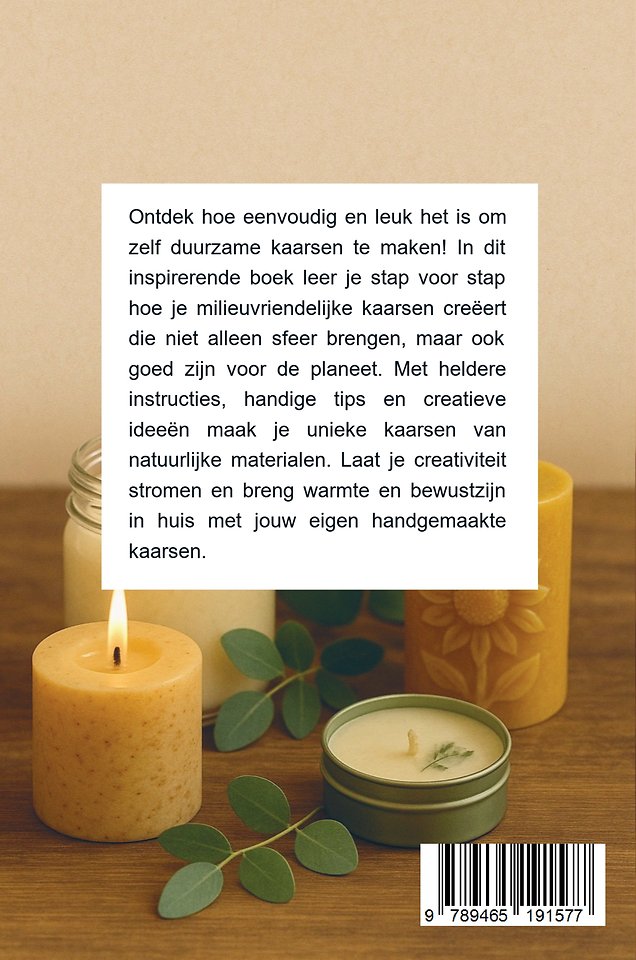 Ontdek hoe eenvoudig en leuk het is om zelf duurzame kaarsen te maken! In dit inspirerende boek leer je stap voor stap hoe je milieuvriendelijke kaarsen creëert die niet alleen sfeer brengen, maar ook goed zijn voor de planeet. Met heldere instructies, handige tips en creatieve ideeën maak je unieke kaarsen van natuurlijke materialen. Laat je creativiteit stromen en breng warmte en bewustzijn in huis met jouw eigen handgemaakte kaarsen.