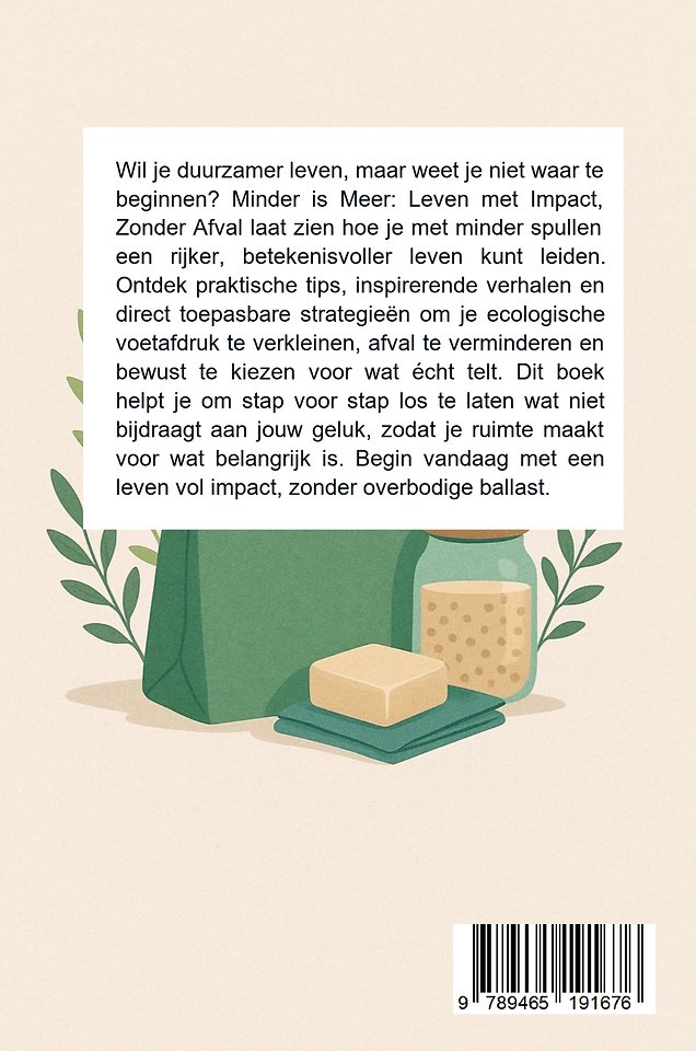 Wil je duurzamer leven, maar weet je niet waar te beginnen? Minder is Meer: Leven met Impact, Zonder Afval laat zien hoe je met minder spullen een rijker, betekenisvoller leven kunt leiden. Ontdek praktische tips, inspirerende verhalen en direct toepasbare strategieën om je ecologische voetafdruk te verkleinen, afval te verminderen en bewust te kiezen voor wat écht telt. Dit boek helpt je om stap voor stap los te laten wat niet bijdraagt aan jouw geluk, zodat je ruimte maakt voor wat belangrijk is. Begin vandaag met een leven vol impact, zonder overbodige ballast.