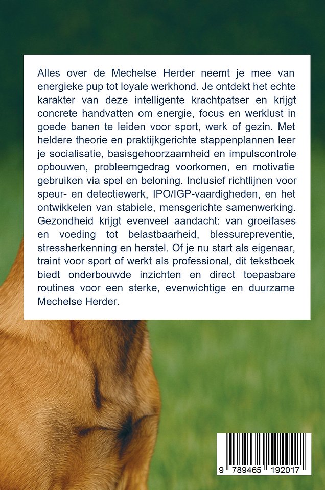 Alles over de Mechelse Herder neemt je mee van energieke pup tot loyale werkhond. Je ontdekt het echte karakter van deze intelligente krachtpatser en krijgt concrete handvatten om energie, focus en werklust in goede banen te leiden voor sport, werk of gezin. Met heldere theorie en praktijkgerichte stappenplannen leer je socialisatie, basisgehoorzaamheid en impulscontrole opbouwen, probleemgedrag voorkomen, en motivatie gebruiken via spel en beloning. Inclusief richtlijnen voor speur- en detectiewerk, IPO/IGP-vaardigheden, en het ontwikkelen van stabiele, mensgerichte samenwerking. Gezondheid krijgt evenveel aandacht: van groeifases en voeding tot belastbaarheid, blessurepreventie, stressherkenning en herstel. Of je nu start als eigenaar, traint voor sport of werkt als professional, dit tekstboek biedt onderbouwde inzichten en direct toepasbare routines voor een sterke, evenwichtige en duurzame Mechelse Herder.