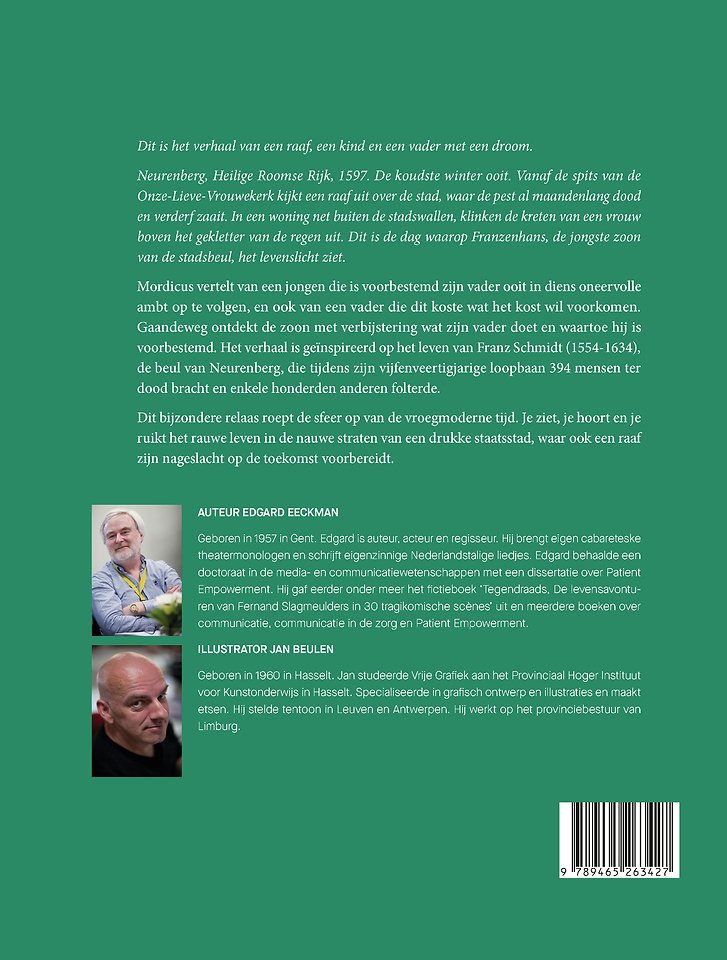 ‘Mordicus’ is het verhaal van een raaf, een kind en een vader met een droom. Neurenberg, Heilige Roomse Rijk, 1597. De koudste winter ooit. Vanaf de spits van de Onze-Lieve-Vrouwekerk kijkt een raaf uit over de stad, waar de pest al maandenlang dood en verderf zaait. In een woning net buiten de stadswallen, klinken de kreten van een vrouw boven het gekletter van de regen uit. Dit is de dag waarop Franzenhans, de jongste zoon van de stadsbeul, het levenslicht ziet. Mordicus vertelt van een jongen die is voorbestemd zijn vader ooit in diens oneervolle ambt op te volgen, en ook van een vader die dit koste wat het kost wil voorkomen. Gaandeweg ontdekt de zoon met verbijstering wat zijn vader doet en waartoe hij is voorbestemd. Het verhaal is geïnspireerd op het leven van Franz Schmidt (1554-1634), de beul van Neurenberg, die tijdens zijn vijfenveertigjarige loopbaan 394 mensen ter dood bracht en enkele honderden anderen folterde. Dit bijzondere relaas roept de sfeer op van de vroegmoderne tijd. Je ziet, je hoort en je ruikt het rauwe leven in de nauwe straten van een drukke staatsstad, waar ook een raaf zijn nageslacht op de toekomst voorbereidt.