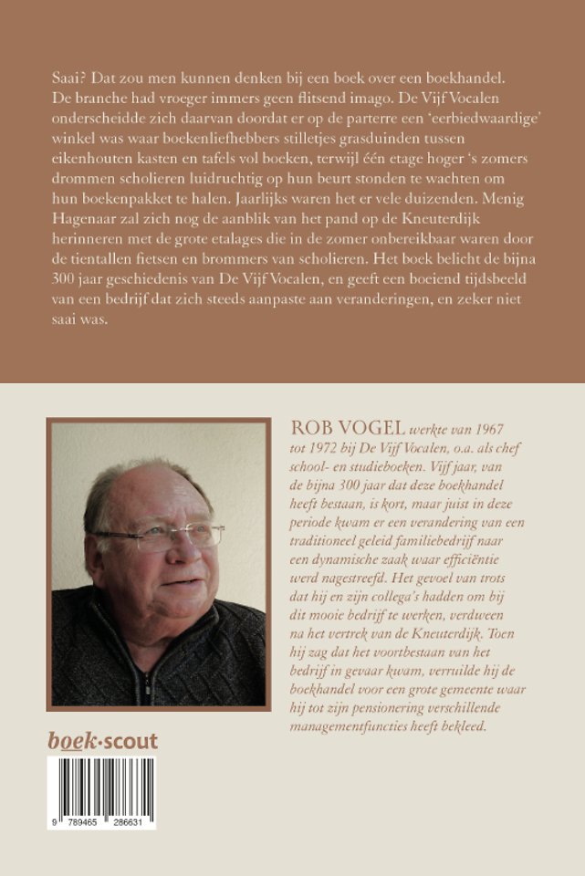 Saai? Dat zou men kunnen denken bij een boek over een boekhandel. De branche had vroeger immers geen flitsend imago. De Vijf Vocalen onderscheidde zich daarvan doordat er op de parterre een ‘eerbiedwaardige’ winkel was waar boekenliefhebbers stilletjes grasduinden tussen eikenhouten kasten en tafels vol boeken, terwijl één etage hoger ‘s zomers drommen scholieren luidruchtig op hun beurt stonden te wachten om hun boekenpakket te halen. Jaarlijks waren het er vele duizenden. Menig Hagenaar zal zich nog de aanblik van het pand op de Kneuterdijk herinneren met de grote etalages die in de zomer onbereikbaar waren door de tientallen fietsen en brommers van scholieren. Het boek belicht de bijna 300 jaar geschiedenis van De Vijf Vocalen, en geeft een boeiend tijdsbeeld van een bedrijf dat zich steeds aanpaste aan veranderingen, en zeker niet saai was.