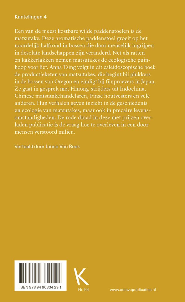 Een van de meest kostbare wilde paddenstoelen is de matsutake. Deze aromatische paddenstoel groeit op het noordelijk halfrond in bossen die door menselijk ingrijpen in desolate landschappen zijn veranderd. Net als ratten en kakkerlakken nemen matsutakes de ecologische puinhoop voor lief. Anna Tsing volgt in dit caleidoscopische boek de productieketen van matsutakes, die begint bij plukkers in de bossen van Oregon en eindigt bij fijnproevers in Japan. Ze gaat in gesprek met Hmong-strijders uit Indochina, Chinese matsutakehandelaren, Finse houtvesters en vele anderen. Hun verhalen geven inzicht in de geschiedenis en ecologie van matsutakes, maar ook in precaire levensomstandigheden. De rode draad in deze met prijzen overladen publicatie is de vraag hoe te overleven in een door mensen verstoord milieu.