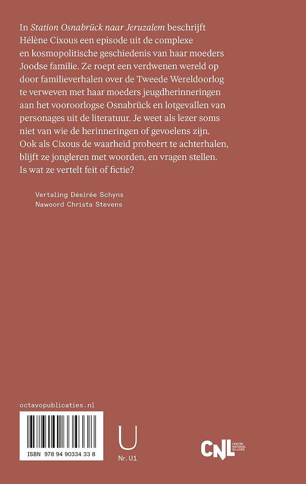 In Station Osnabrück naar Jeruzalem beschrijft Hélène Cixous een episode uit de complexe en kosmopolitische geschiedenis van haar moeders Joodse familie. Ze roept een verdwenen wereld op door familieverhalen over de Tweede Wereldoorlog te verweven met haar moeders jeugdherinneringen aan het vooroorlogse Osnabrück en lotgevallen van personages uit de literatuur. Je weet als lezer soms niet van wie de herinneringen of gevoelens zijn. Ook als Cixous de waarheid probeert te achterhalen, blijft ze jongleren met woorden, en vragen stellen. Is wat ze vertelt feit of fictie?