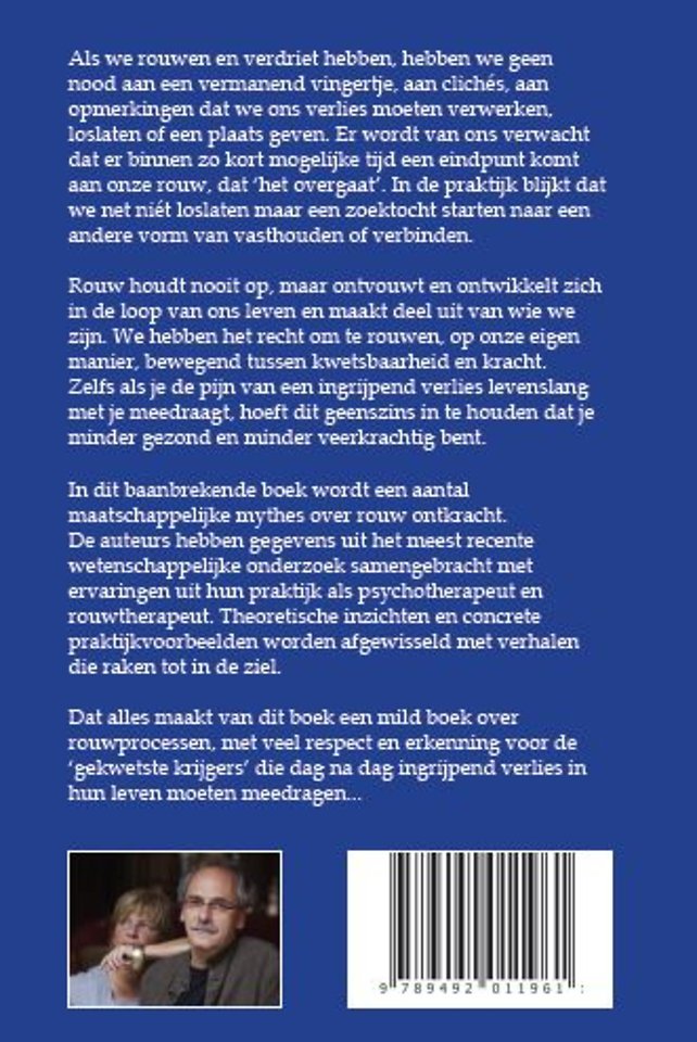 Als we rouwen en verdriet hebben, hebben we geen nood aan een vermanend vingertje, aan clichés, aan opmerkingen dat we ons verlies moeten verwerken, loslaten of een plaats geven. Er wordt van ons verwacht dat er binnen zo kort mogelijke tijd een eindpunt komt aan onze rouw, dat het overgaat. In de praktijk blijkt dat we net niet loslaten maar een zoektocht starten naar een andere vorm van vasthouden of verbinden. Rouw houdt nooit op, maar ontvouwt en ontwikkelt zich in de loop van ons leven en maakt deel uit van wie we zijn. We hebben het recht om te rouwen, op onze eigen manier, bewegend tussen kwetsbaarheid en kracht. Zelfs als je de pijn van een ingrijpend verlies levenslang met je meedraagt, hoeft dit geenszins in te houden dat je minder gezond en minder veerkrachtig bent. In dit baanbrekende boek wordt een aantal maatschappelijke mythes over rouw ontkracht. De auteurs hebben gegevens uit het meest recente wetenschappelijke onderzoek samengebracht met ervaringen uit hun praktijk als psychotherapeut en rouwtherapeut. Theoretische inzichten en concrete praktijkvoorbeelden worden afgewisseld met verhalen die raken tot in de ziel.