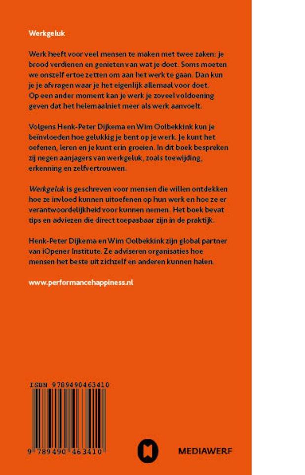 Volgens Henk-Pieter Dijkema en Wim Oolbekkink kun je beïnvloeden hoe gelukkig je bent op je werk. Je kunt het oefenen, leren en je kunt erin groeien. In dit boek bespreken zij negen aanjagers van werkgeluk, zoals toewijzing, erkenning en zelfvertrouwen.