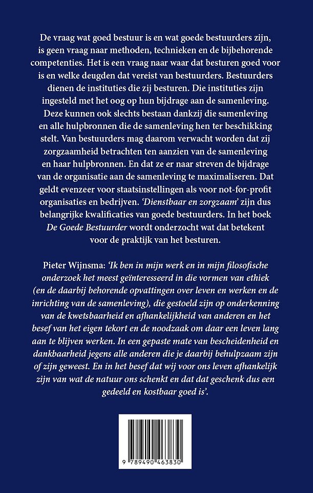 Meer over Pieter WijnsmaDe vraag wat goed bestuur is en wat goede bestuurders zijn, is geen vraag naar methoden, technieken en de bijbehorende competenties. Het is een vraag naar waar dat besturen goed voor is en welke deugden dat vereist van bestuurders.
