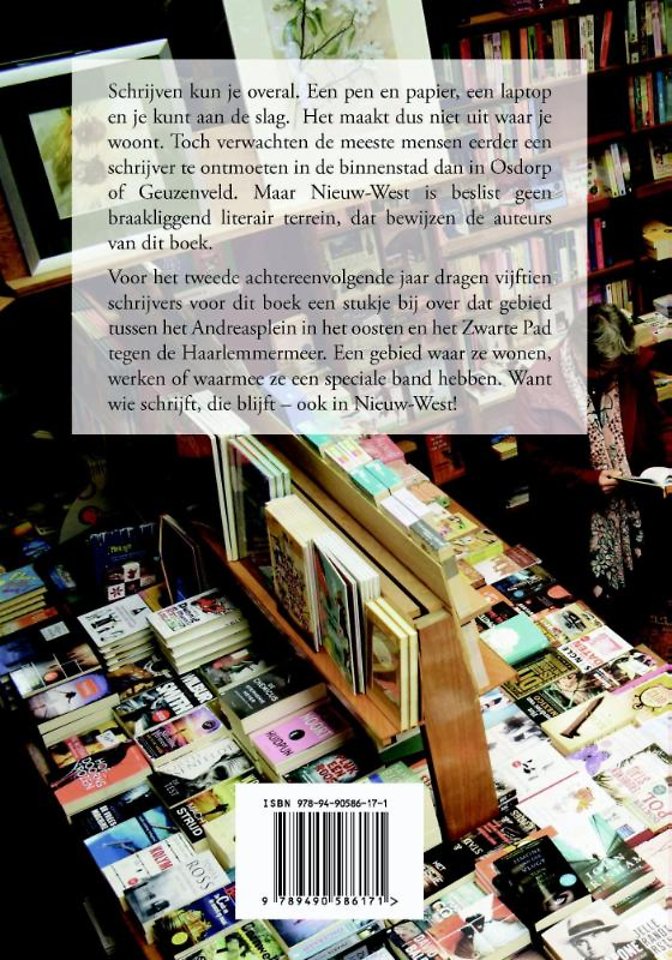 Amsterdam Nieuw-West is niet een gebied waarbij iedereen meteen aan een rijke literaire traditie denkt. Toch is het de samenstellers gelukt om voor het tweede achtereenvolgende jaar vijftien schrijvers een stukje te laten schrijven over dat gebied tussen het Andreasplein in het oosten en het Zwarte Pad tegen de Haarlemmermeer. Een gebied waar ze wonen, werken of waarmee ze een speciale band hebben. Want wie schrijft, die blijft - ook in Nieuw-West!