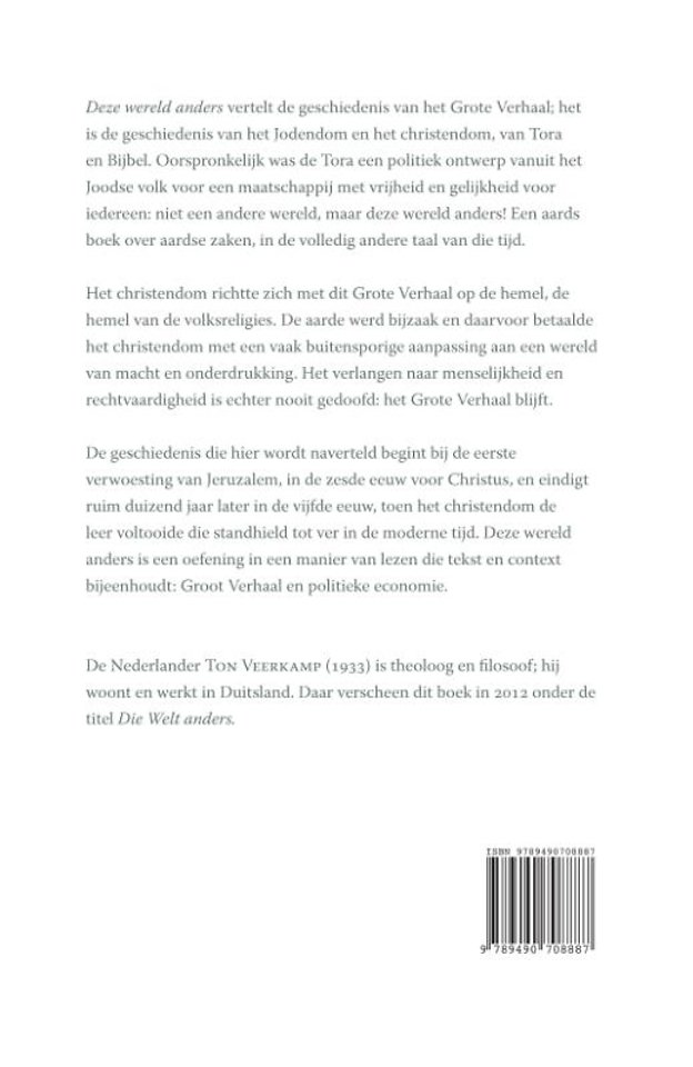 'Deze wereld anders' vertelt de geschiedenis van het Grote Verhaal; het is de geschiedenis van het Jodendom en het christendom, van Tora en Bijbel. 'Deze wereld anders' is een oefening in een manier van lezen die tekst en context bijeenhoudt: Groot Verhaal en politieke economie.