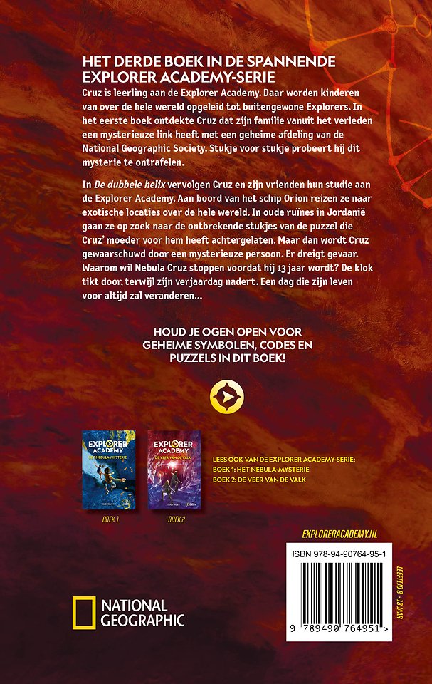 In De dubbele helix vervolgen Cruz en zijn vrienden hun studie aan de Explorer Academy. Aan boord van het schip Orion reizen ze naar exotische locaties over de hele wereld. In oude ruïnes in Jordanië gaan ze op zoek naar de ontbrekende stukjes van de puzzel die Cruz’ moeder voor hem heeft achtergelaten. Maar dan wordt Cruz gewaarschuwd door een mysterieuze persoon. Er dreigt gevaar. Waarom wil Nebula Cruz stoppen voordat hij 13 jaar wordt? De klok tikt door, terwijl zijn verjaardag nadert. Een dag die zijn leven voor altijd zal veranderen…
