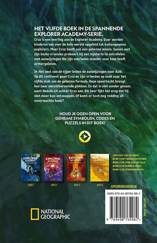In deel 5 van de Explorer Academy reeks, Het nest van de tijger, leiden alle aanwijzingen naar Azië. Op dit continent gaan Cruz en zijn vrienden op zoek naar het vijfde stuk van de geheime formule. Deze speurtocht brengt hen naar wereldberoemde plekken. En dat is niet zonder gevaar, want Nebula zit achter Cruz aan. Dit keer lijkt het erop dat hij niet meer kan ontsnappen. Of komt er toch nog redding uit onverwachte hoek?