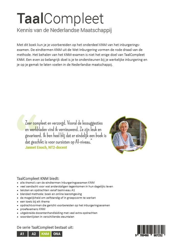 De eindtermen KNM uit de Wet Inburgering vormen de rode draad van de methode. Het behalen van het KNM-examen is niet het enige doel van TaalCompleet KNM. Een even zo belangrijk doel is je te ondersteunen bij je werkelijke inburgering en je op je gemak te laten voelen in de Nederlandse maatschappij.