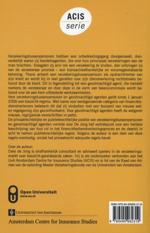 De privaatrechtelijke en publiekrechtelijke positie van verzekeringstussenpersonen en gevolmachtigd agenten vormde voor De Jong het vertrekpunt voor een heldere beschrijving van hun rol in het financiëledienstverleningsproces en de daarbij in acht te nemen publiekrechtelijke regels. Volgens de auteur is een deel van deze regels overbodig, omdat het privaatrecht adequate regels bevat.